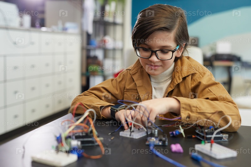 Мальчик в классе инженерии в школе