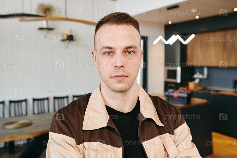 Мужчина в коричневой рубашке стоит напротив кухонной среды