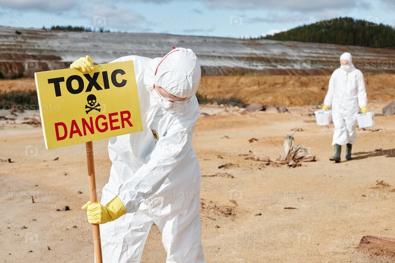 Экологический ученый в защитной одежде устанавливает знак с текстом 'Токсическая опасность' на свалке после экологической катастрофы