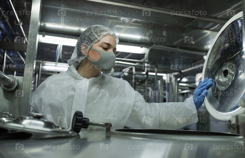 Молодая женщина-работница контролирует производство на фабрике чистой пищи