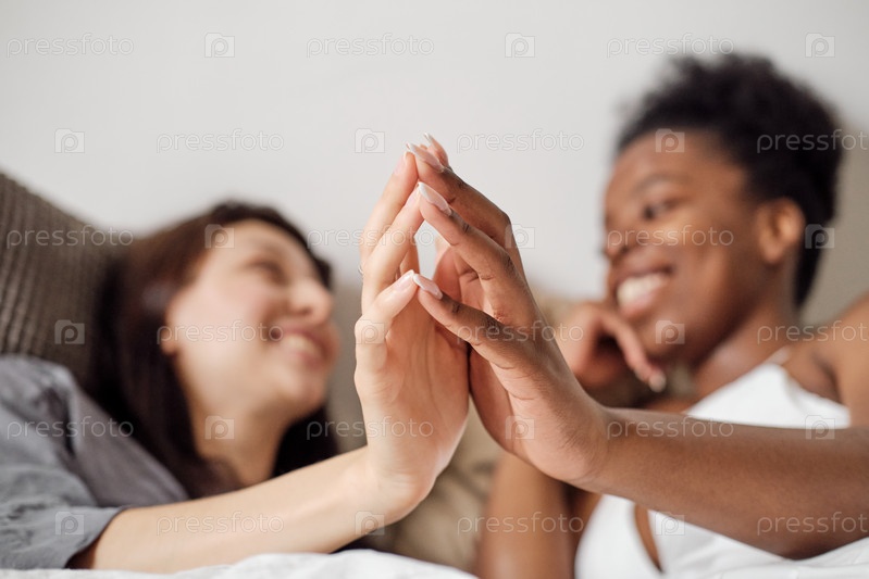 Руки счастливых лесбийских женщин, расслабляющихся в постели