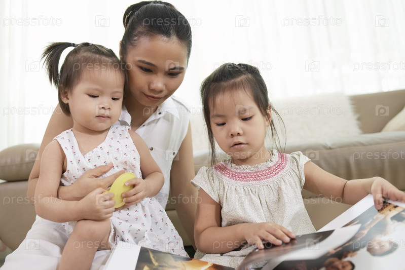 Девочки и мать смотрят на фотографии