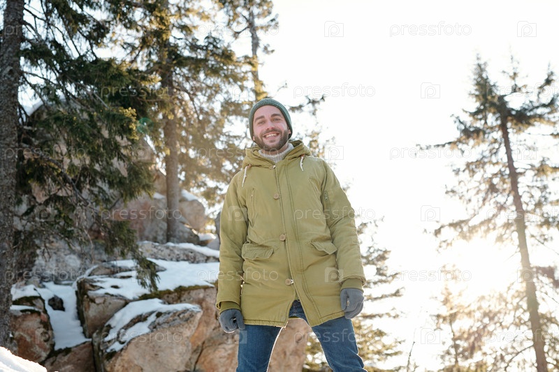 Счастливый молодой человек смотрит на тебя в холодный зимний день