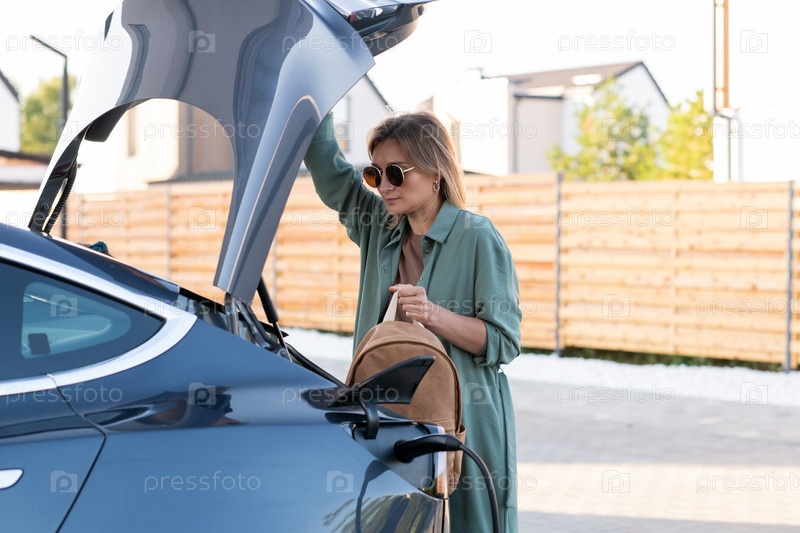 Молодая блондинка выносит рюкзак из багажника, пока заряжается автомобиль