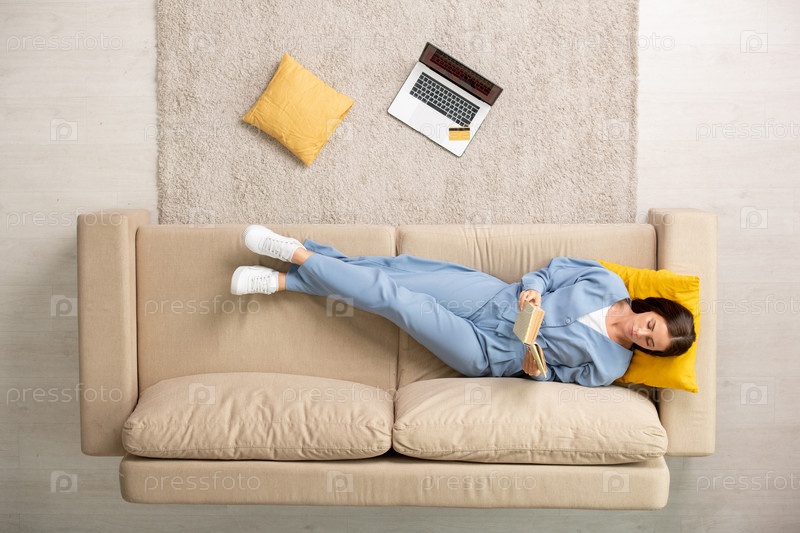 Вид сверху молодой расслабленной брюнетки женщины в синей пижаме, читающей книгу на диване
