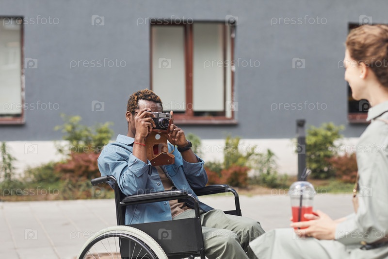 Фотограф в инвалидной коляске фотографирует женщину