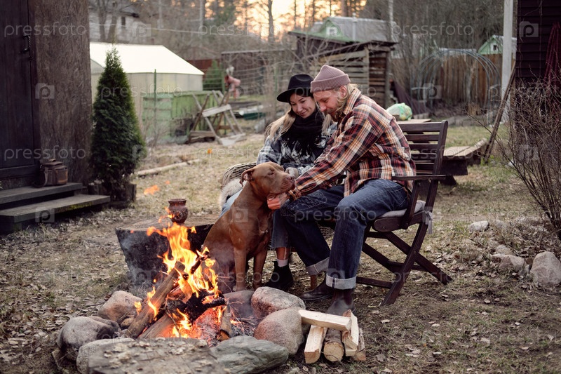 Пара, сидящая возле камина на свежем воздухе