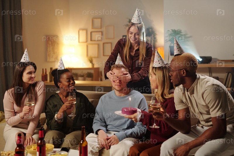 Веселые молодые межкультурные друзья поздравляют взволнованного парня с днем рождения