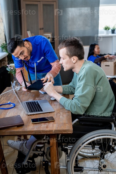 Мужчина-доброволец помогает инвалиду с помощью маршрутизатора
