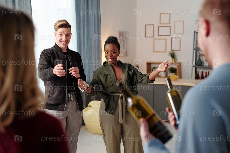 Веселая молодая межкультурная пара встречает своих друзей с бутылками вина