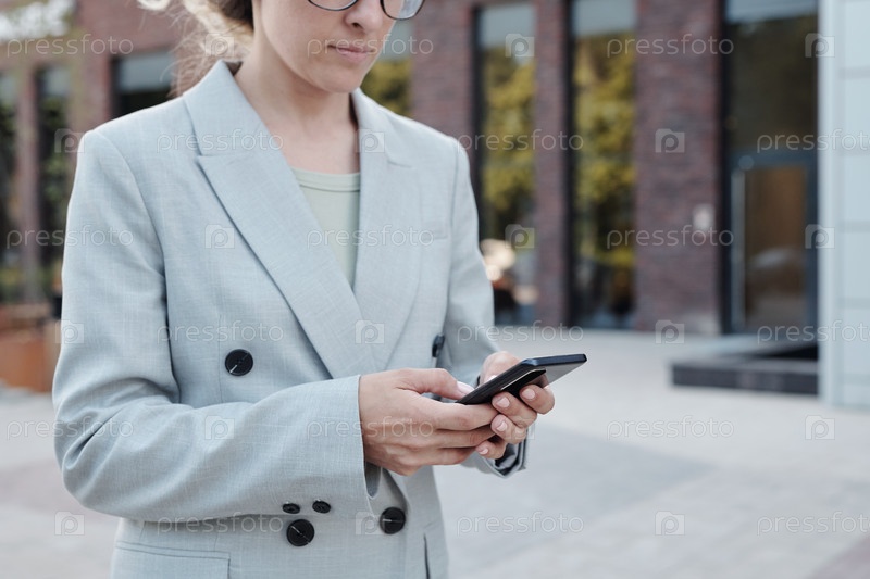 Молодая бизнес-женщина прокручивает смартфон против городской среды
