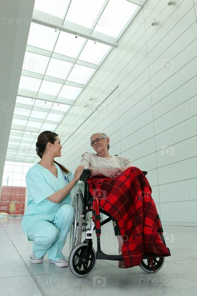 Молодая медсестра и пожилая женщина в инвалидной коляске в больнице