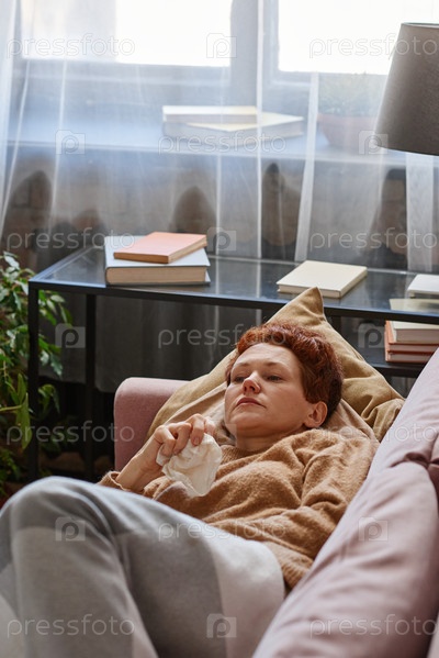 Вертикальный высокоугольный снимок женщины, страдающей гриппом, держащей бумажный салфетку и отдыхающей на диване дома
