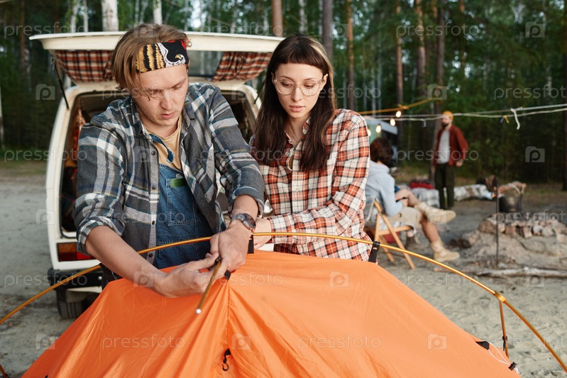 Два туриста устанавливают палатку