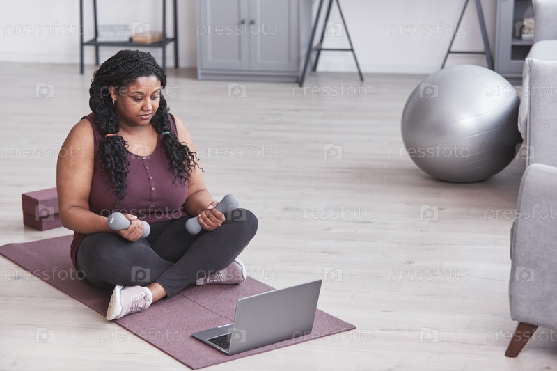 Избыточный вес афроамериканская женщина на домашней тренировке
