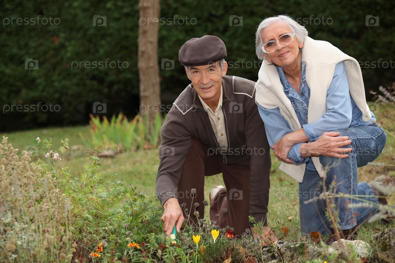 Пожилая пара занимается садоводством