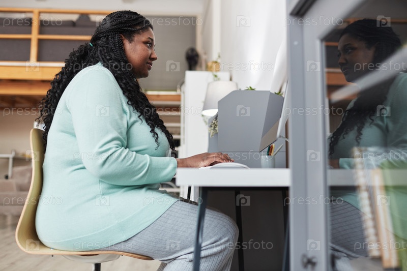 Афроамериканская женщина с избыточным весом, использующая компьютер в домашних условиях