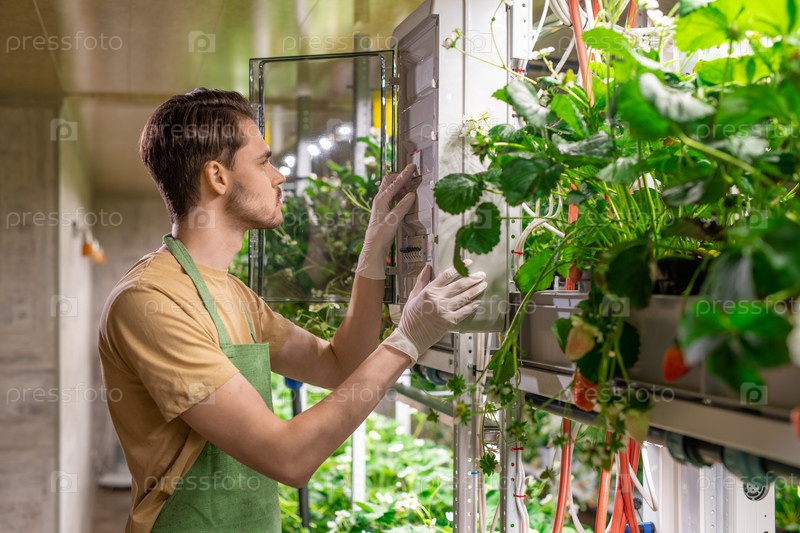 Человек в фартуке и перчатках, работающий на вертикальной ферме