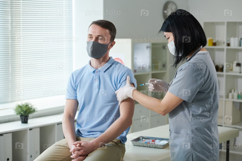 Медсестра азиатской этнической принадлежности в униформе и защитной маске прививает молодого человека