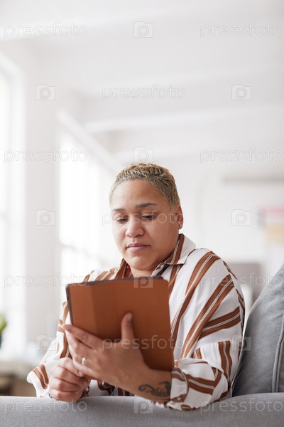 Современная смешанная раса женщина, использующая планшет дома