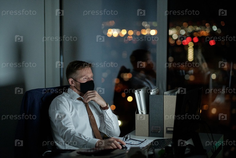 Молодой рабочий с белыми воротничками в защитной маске смотрит на компьютерный экран