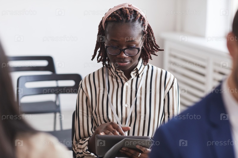Афроамериканская женщина делает заметки на конференции
