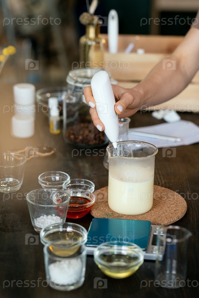 Рука женщины, помещающей жидкое вещество в стеклянную посуду с расплавленной массой мыла
