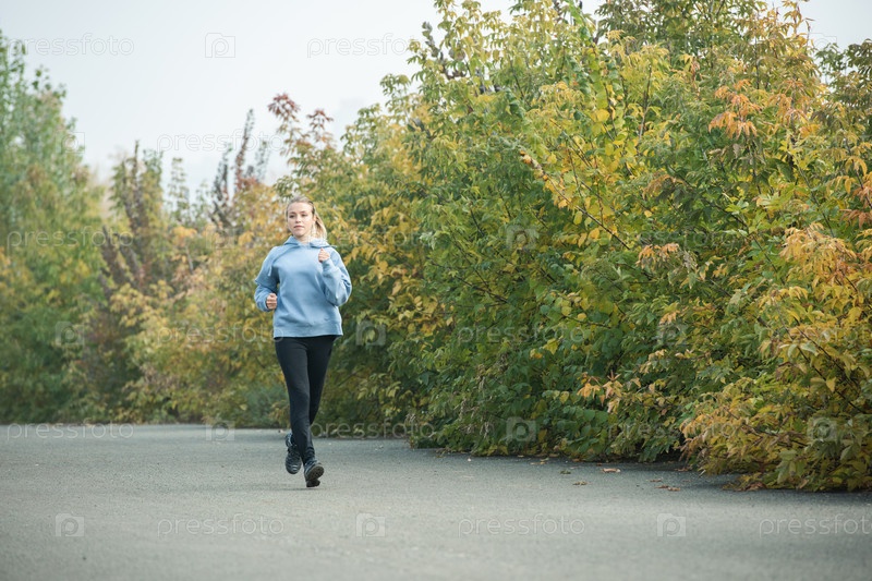 Спортивная и здоровая молодая блондинка в спортивной одежде бегает по дороге в парке