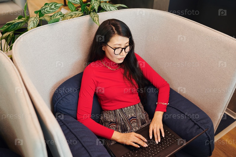 Уверенная в себе молодая женщина - офисный менеджер или дизайнер, нажимающая кнопки ноутбука