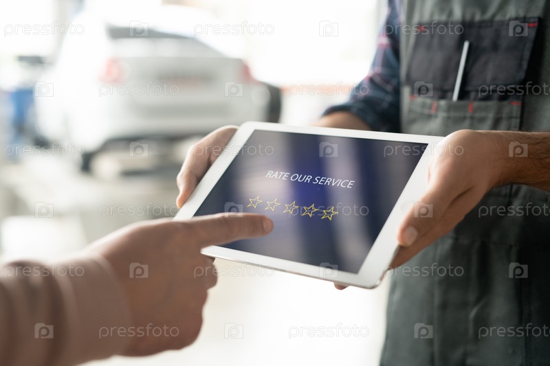 Техник центра технического обслуживания автомобилей держит планшет с пятью звездами на дисплее