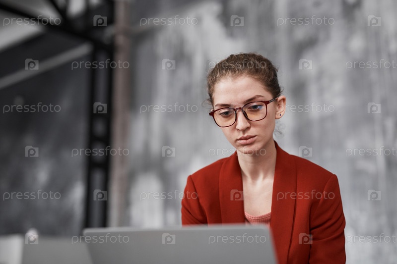 Деловая женщина, одетая в красный цвет с помощью ноутбука
