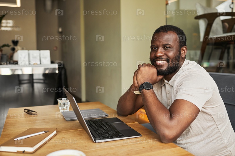 Улыбающийся чернокожий мужчина работает за столом в кафе