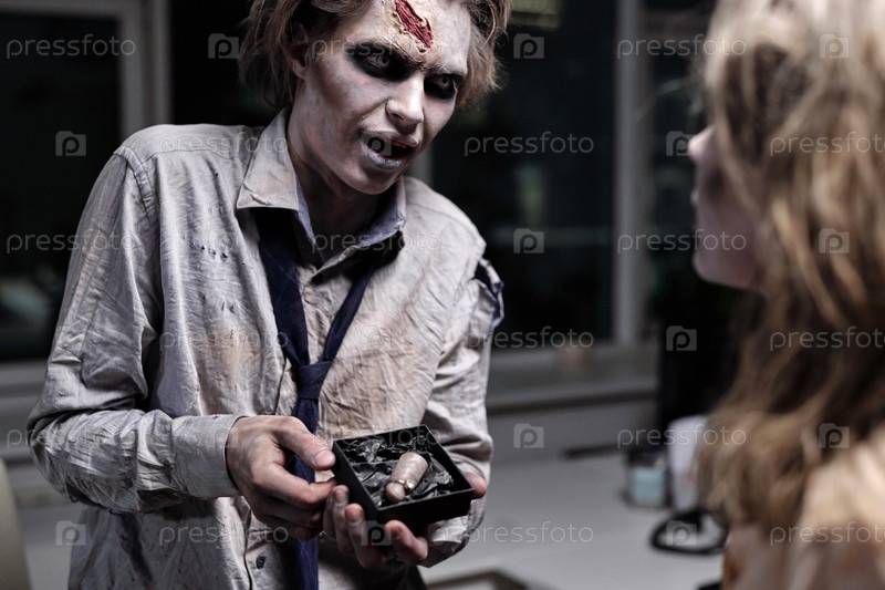 Мужчина-зомби показывает женщине отрезанный большой палец