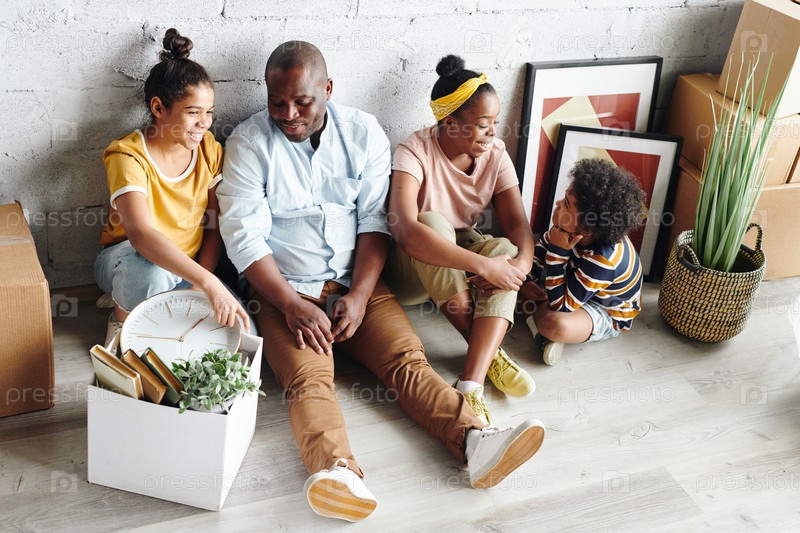 Молодая веселая семья отца, матери, маленького сына и дочки-подростка разговаривают в гостиной