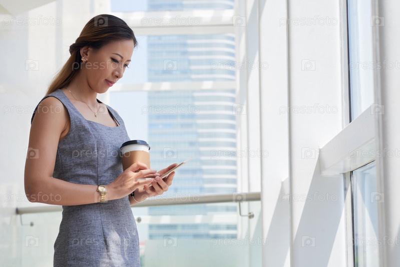 Молодая бизнесвумен отправляет текстовое сообщение азиатскому мужчине