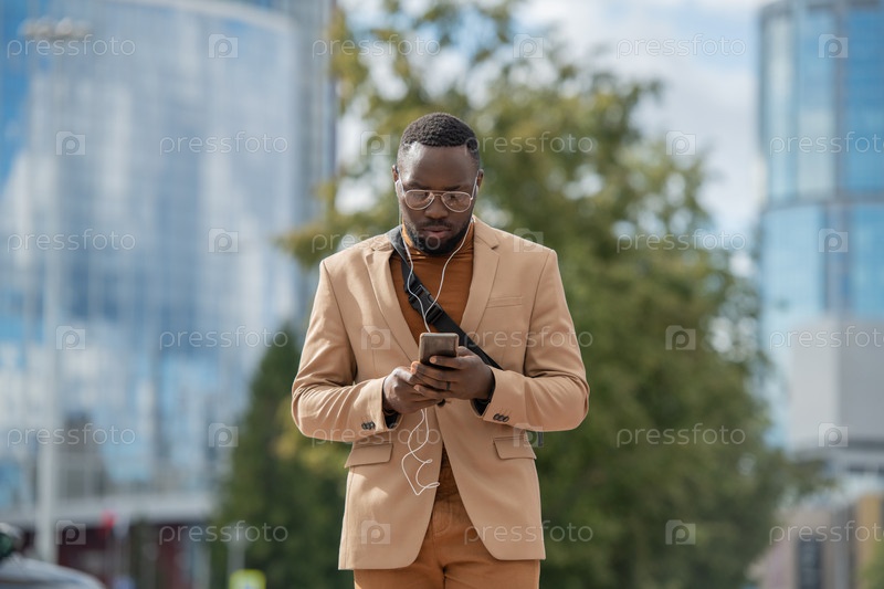Молодой бизнесмен просматривает плейлист в смартфоне