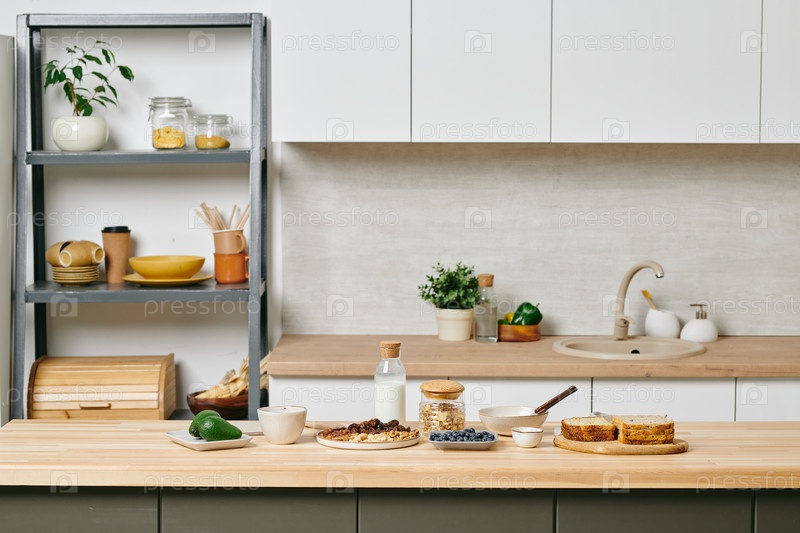 Кухня с полкой кухонной утвари и деревянным столом с едой