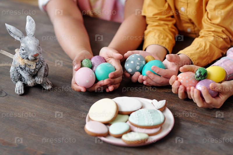 Руки межкультурных маленьких детей в повседневной одежде, держащих окрашенные пасхальные яйца