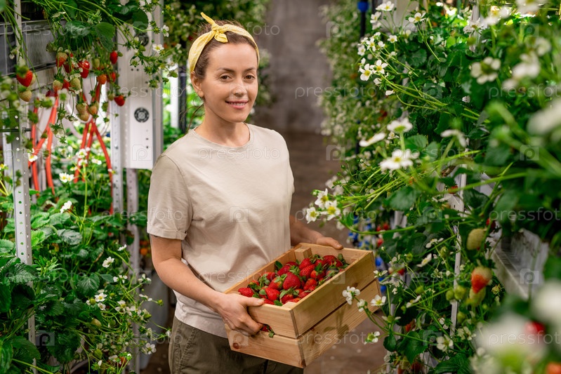 Счастливая молодая женщина-работница вертикальной фермы, держащая деревянную коробку с свежеспелыми клубниками