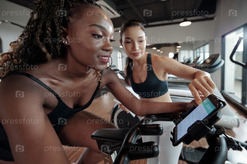 Спортсменка проверяет прогресс на смартфоне