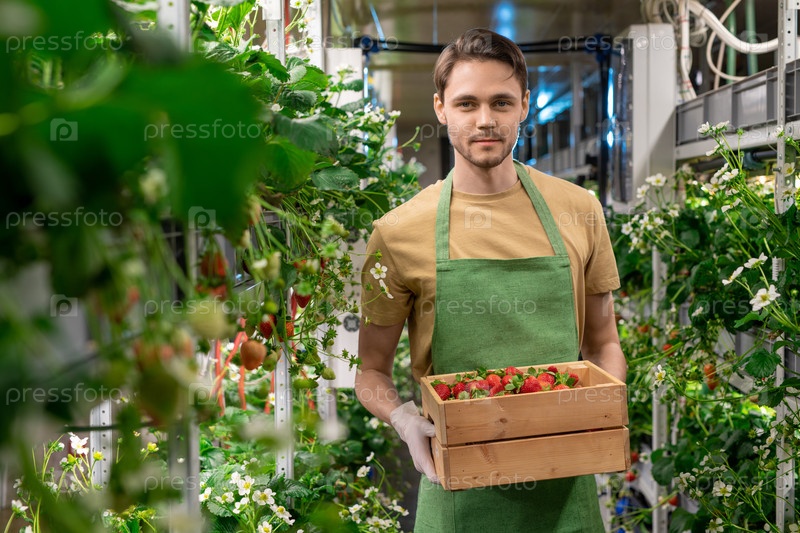 Счастливый молодой мужской работник вертикальной фермы или теплицы, держащий деревянную коробку со спелыми клубниками