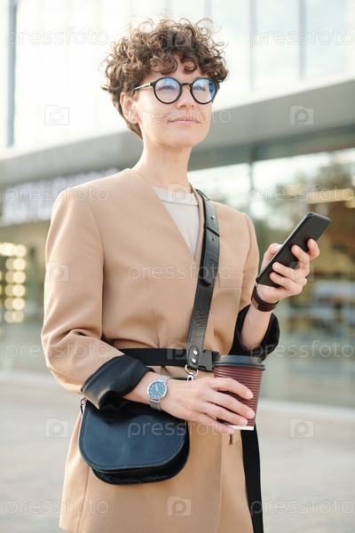 Молодая безмятежная или задумчивая бизнес-леди с напитком и сумочкой ждет такси