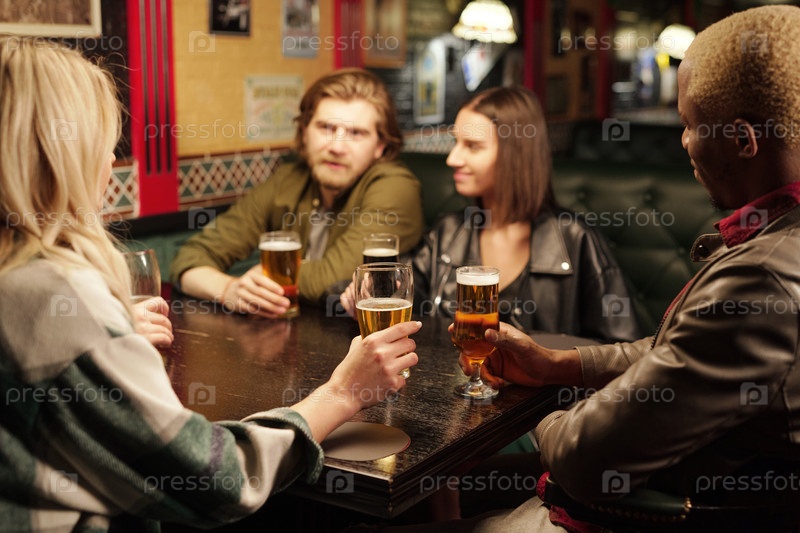 Молодые межкультурные друзья сидят за столом в пабе, пьют пиво и обсуждают