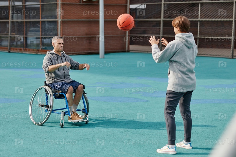Человек с параличом играет в баскетбол на свежем воздухе