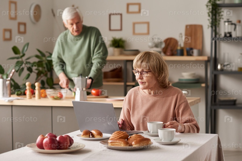 Пожилая женщина работает на ноутбуке дома
