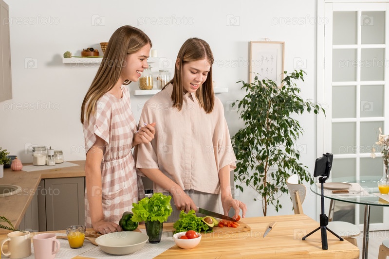 Две девочки-подростки готовят овощный салат во время прямой трансляции
