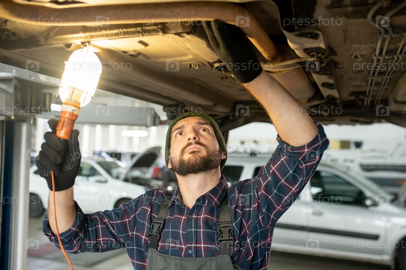 Молодой мастер-ремонтник в перчатках и униформе держит лампу, проверяя детали