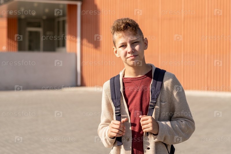 Мальчик-подросток с рюкзаком стоит напротив школьного здания
