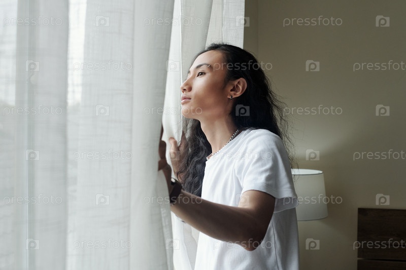 Молодой человек смотрит в гостиничное окно