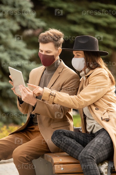 Молодая стильная пара в защитных масках использует планшет, отдыхая в парке